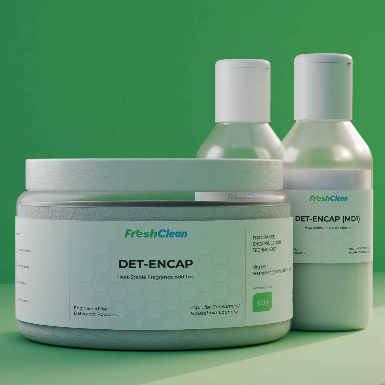DET-ENCAP is a powdered encapsulated fragrance for detergent formulations, designed for easy blending and processing, delivering consistent, longlasting fragrance release during and after washing.